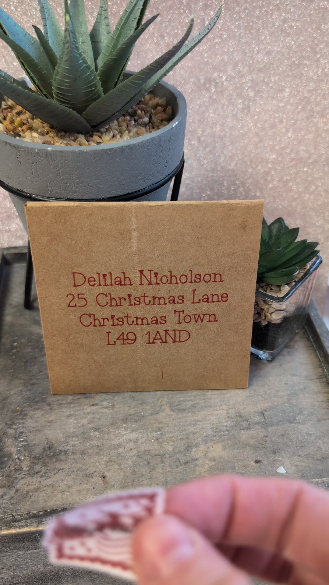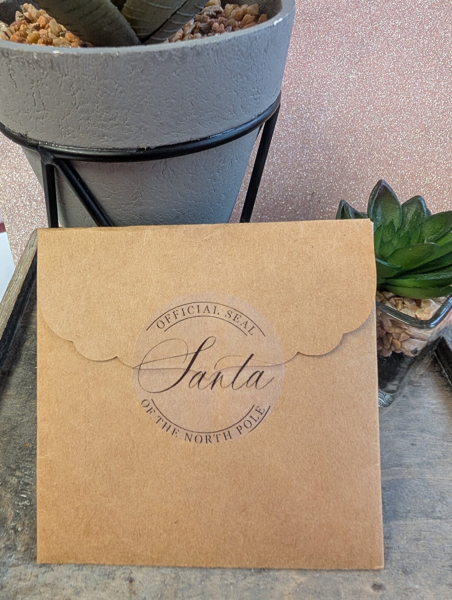 Each 10cm x 10cm kraft card envelope includes a personalised letter inside featuring your child’s name, making it feel truly magical and authentic. The envelope itself is hand-addressed with your child’s name and address, stamped with Santa’s Sleigh Mail, and sealed at the back with an official Santa seal sticker.