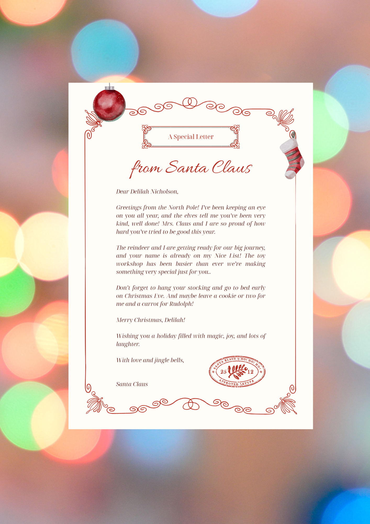 Every detail — from the handwritten name to the official Santa seal — is made to capture the wonder of Christmas morning. This isn’t just a letter; it’s a magical keepsake that keeps the spirit of Santa alive.